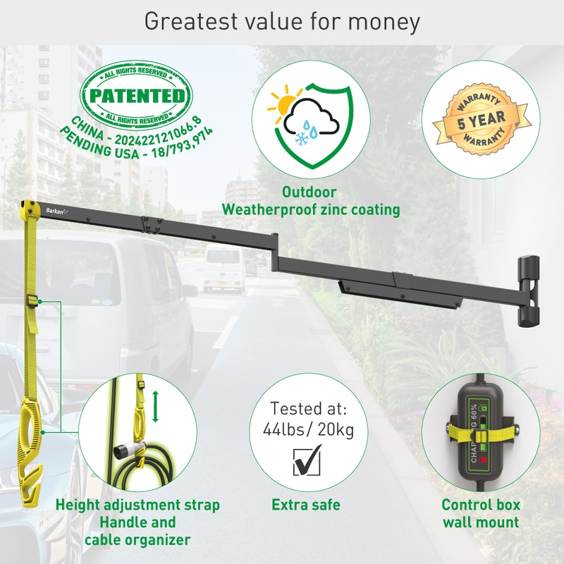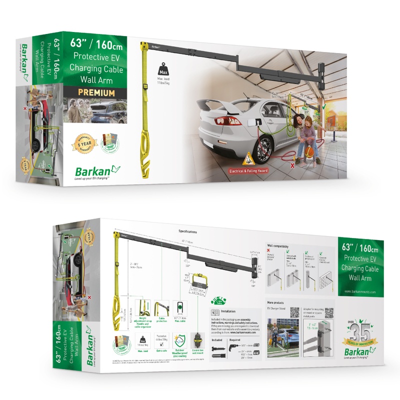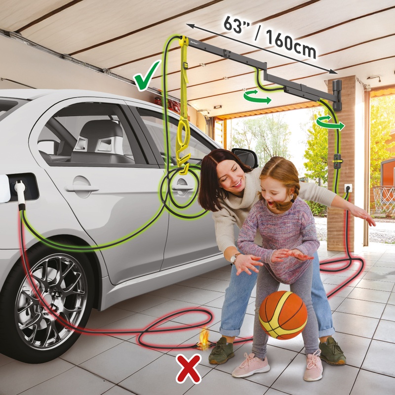 The Barkan Electric Vehicle Charging Cable Wall Arm protects against these hazards by lifting the cable above head height, concealing most of it inside the mount, which serves as a “cable conduit," and shielding it from potential damage.