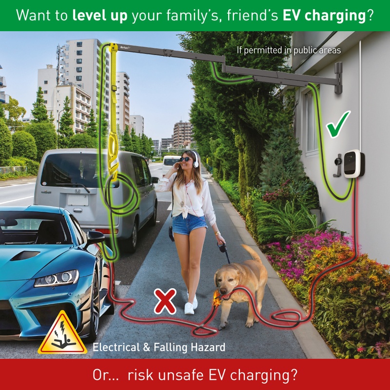 A flexible charging cable left on the ground poses significant risks to the user, their family, and pedestrians, leading to trips, falls, and, even more concerning, the risk of electrocution due to cable damage (from heavy or sharp objects, pets, rodents, wear and tear over time, and especially contact with water or rain).