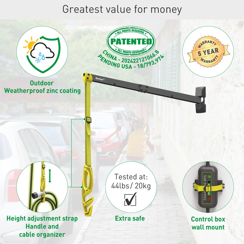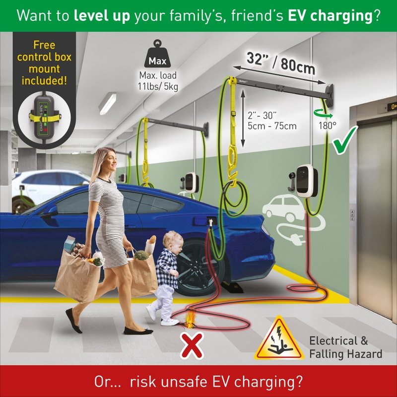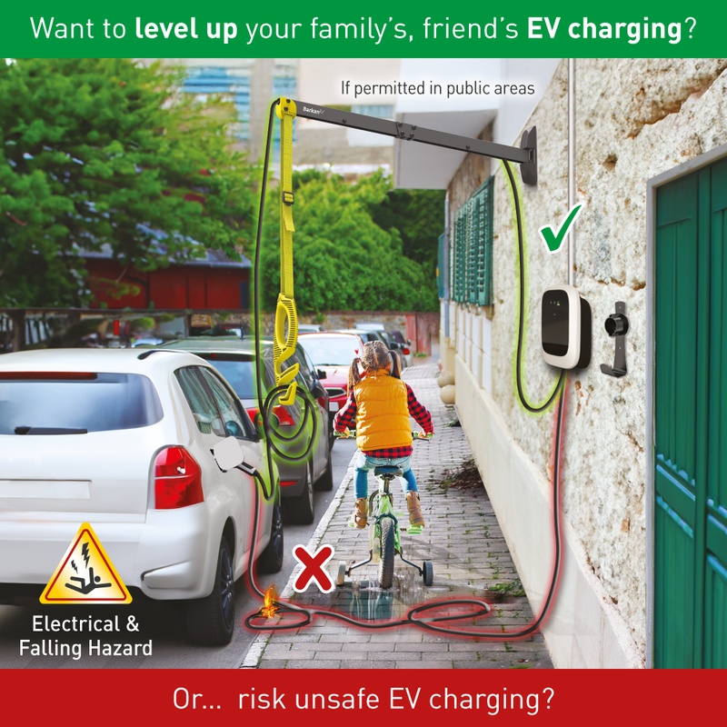 The Barkan Electric Vehicle Charging Cable Wall Arm protects against these hazards by lifting the cable above head height, concealing most of it inside the mount, which serves as a “cable conduit," and shielding it from potential damage.