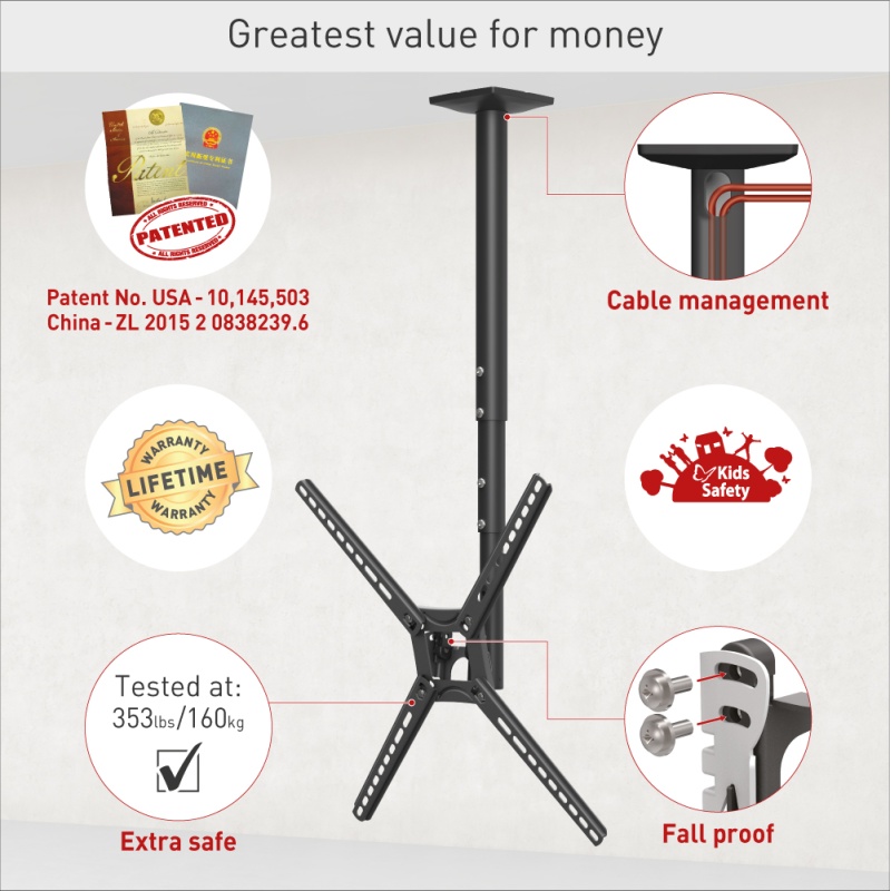 Kinnitusel on teleskoopne kõrguse reguleerimine, ekraani ühendusplaadi juures maksimaalselt 160° pööratav, lisaks võimaldab tööriistavaba kallutamist vahemikus 0° kuni 20° ja +/-5° nivelleerimist pärast paigaldust.