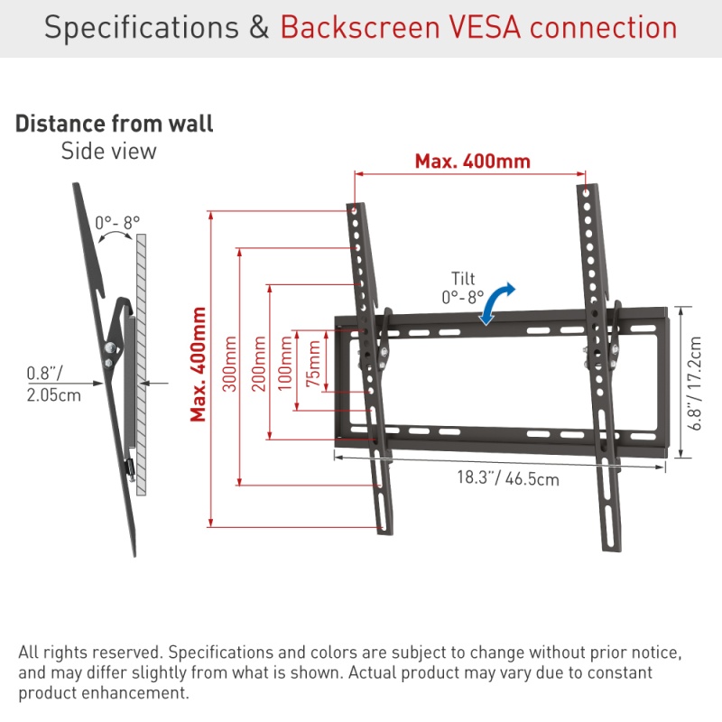 VESA standard 75x75, 100x100, 100x200, 200x100, 200x200, 200x300, 300x200, 300x300, 300x400, 400x200, 400x300, 400x400 mm ja mitte VESA kuni 400x400 mm